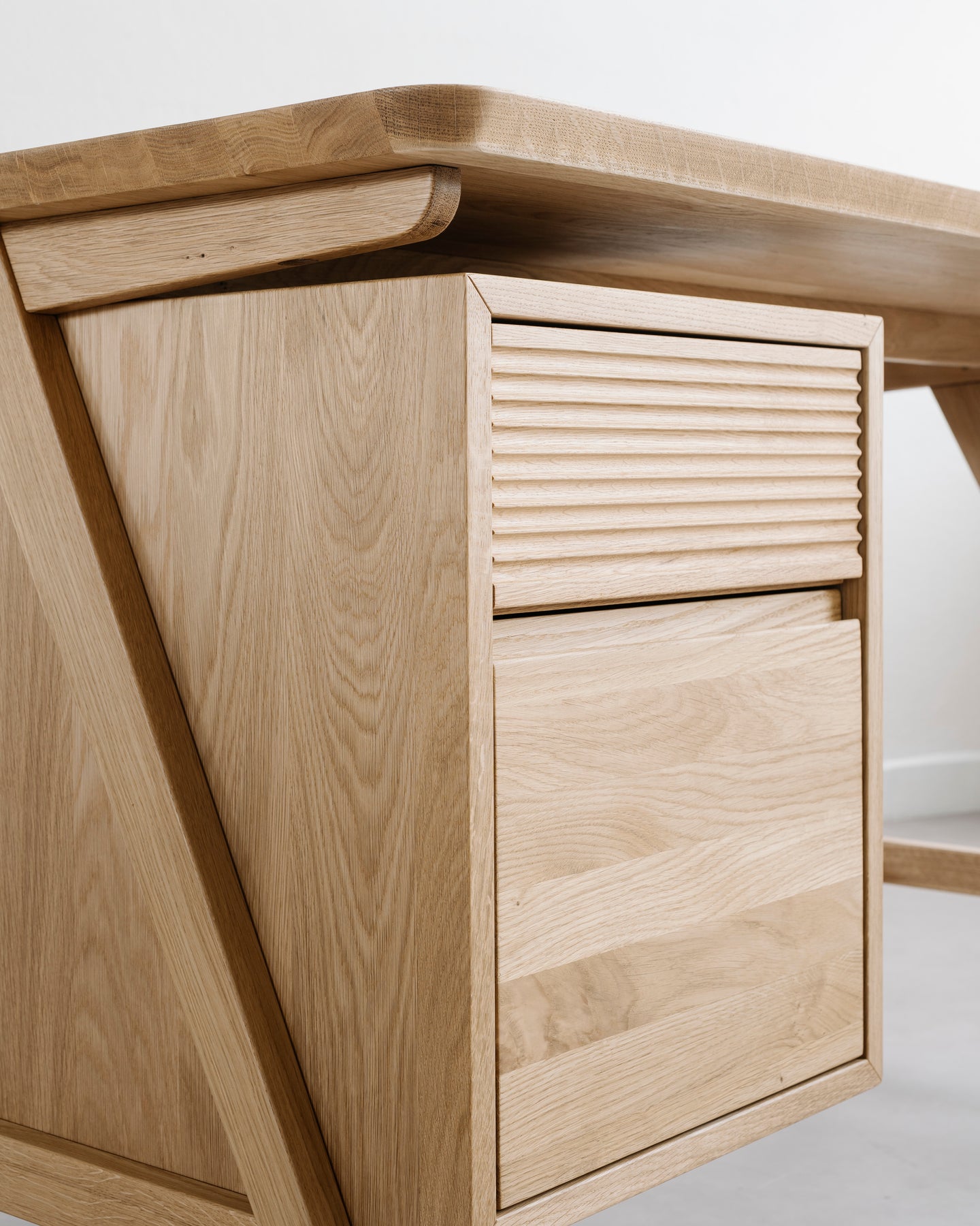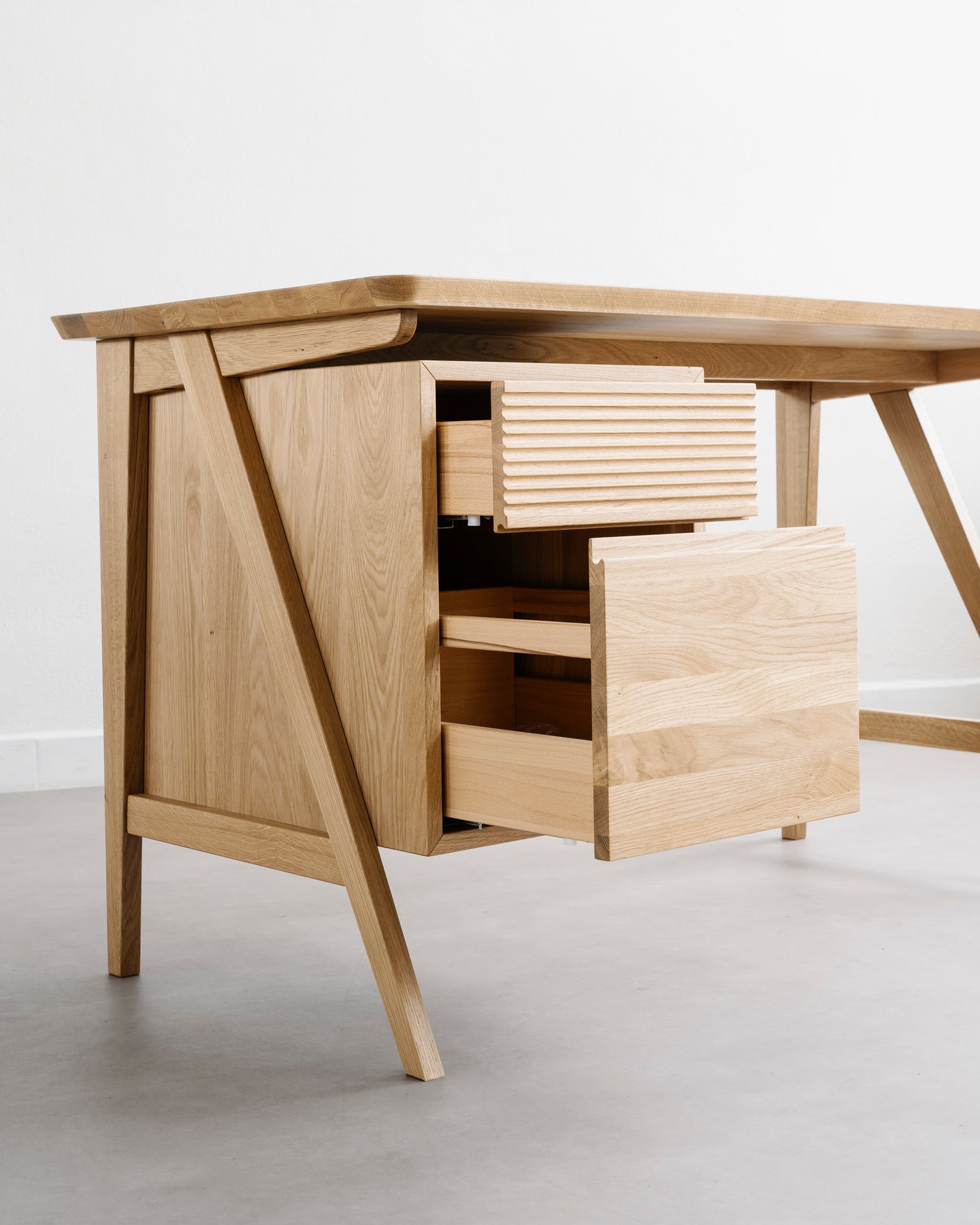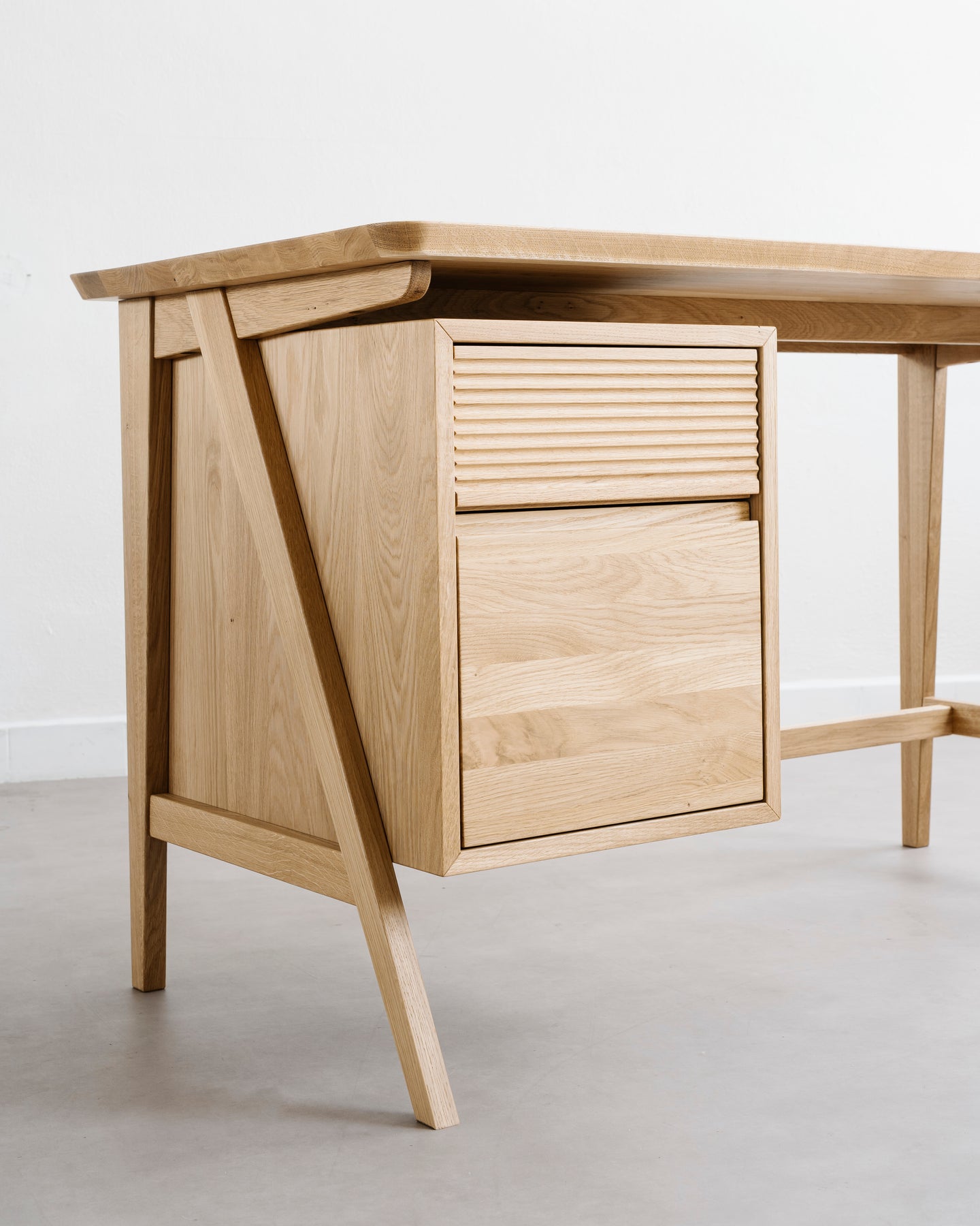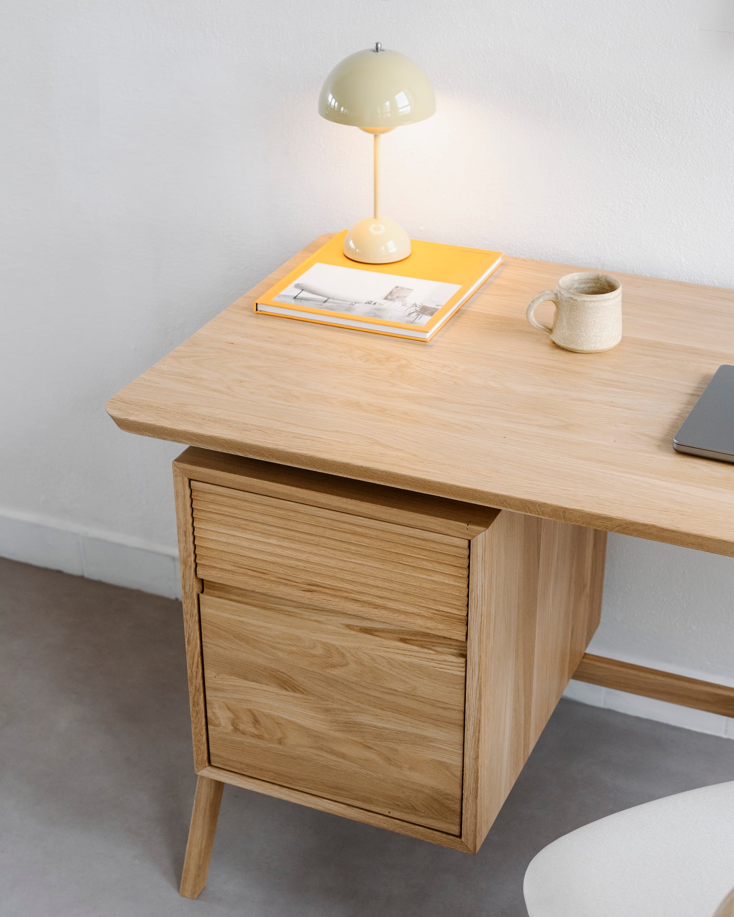 Pracovní stůl Bryno je přirozeným rozšířením vlastních návrhů studia TeakPeak. Je navržen pro soustředění a každodenní práci. Tvar je klidný a vyvážený, nestojí v cestě vaší kreativitě a snadno souzní s mnoha prostory. Detaily jsou střídmé ale funkční. Dubové masivní dřevo upomíná na hřejivost přírodních materiálů.